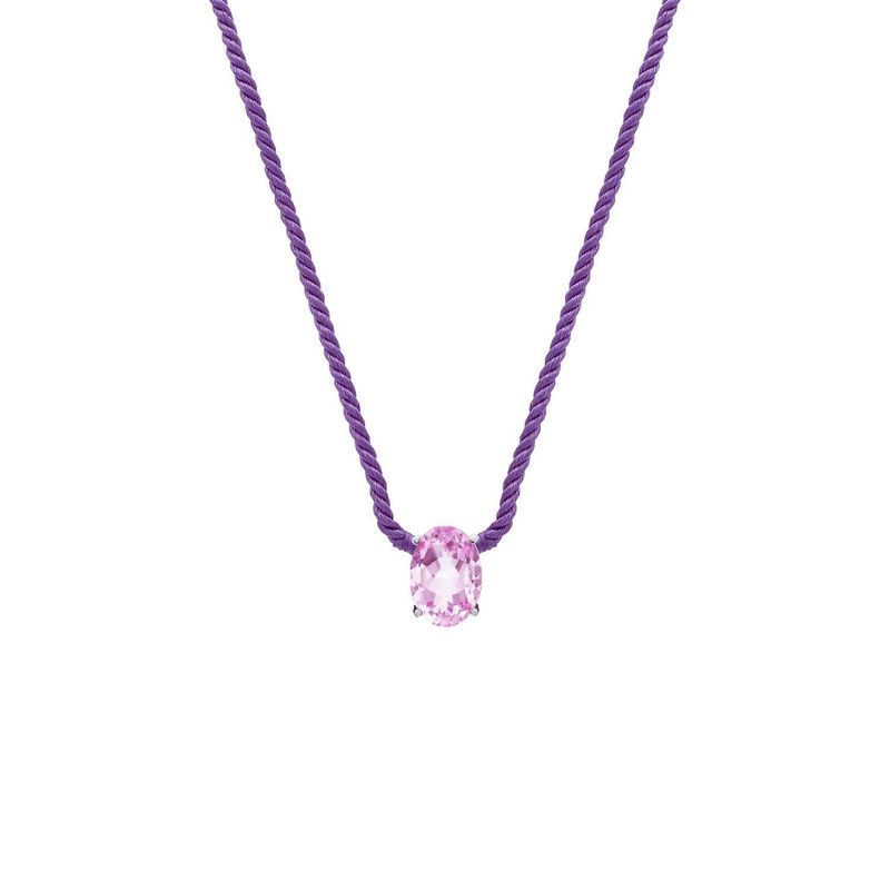 Colar delicado e contemporâneo, com cordão em seda roxa e pedra central em quartzo rosa lapidação oval. Uma peça versátil, que une cor e sofisticação em um design minimalista e elegante.